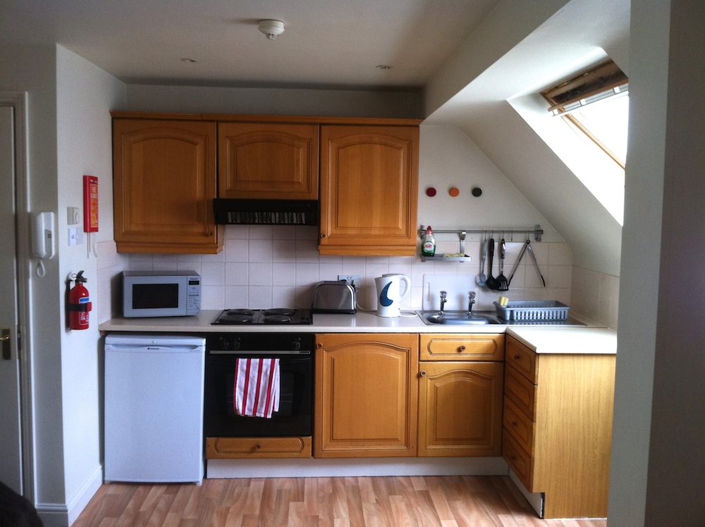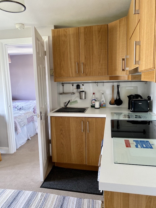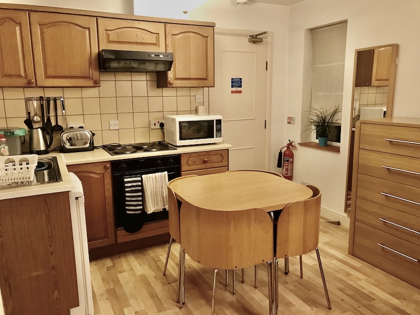 Fully fitted kitchen equipped with kitchen basics including tea, coffee, sugar, milk, and condiments etc.